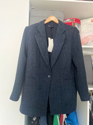 Chaqueta de corte moderno con estampado de pata de gallo. - Cuello alto con solapa. - Cierre cruzado con botones. - Bolsillos delanteros. - Puños y cintura ajustables. Nunca usada