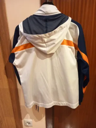 Chándal deportivo Nike con diseño moderno. - Mangas y detalles en azul marino. - Rayas naranjas en el pecho. - Capucha integrada. - Cierre de cremallera frontal..... Pone XL pero yo creo que también puede ser una L.....tiene cremalleras en bolsillos completamente nuevas...en todos sus bolsillos