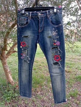Pantalón vaquero azul con bordados y descosidos. - Detalles de bordados florales y mariposa. - Aberturas desgastadas y rotos. - Lavado desgastado. - Tiras rosas para sujección en percha.