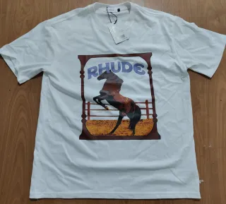 🔥Marca: Rhude (no original) 🏷️Talla: L ⚪Color: Blanco ✅Estado: Un solo uso y sin desperfectos. Camiseta blanca de Rhude con un diseño gráfico de un caballo. Es tela muy gordita y el diseño es idéntico. De talla es algo grande para ser una L pero es diseño oversize. Respondo rápido, clientes serios.