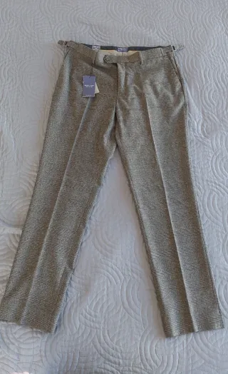 Pantalón de vestir con un diseño de espiga sutil. Elegante y con un tacto muy agradable. Nuevo totalmente, conserva las etiquetas. Ver medidas en las fotos. - Cintura ajustable con hebillas laterales. - Cierre de botón y cremallera. - Bolsillos delanteros y traseros.