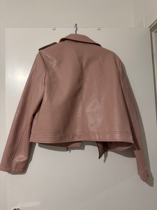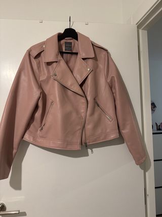 Chaqueta de estilo motero en color rosa, perfecta para añadir un toque moderno a tu armario. - Diseño con cremallera asimétrica. - Cuello solapa con botones. - Bolsillos frontales con cremallera.