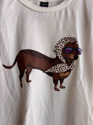 Camiseta blanca con un divertido estampado de perro salchicha con gafas de sol y pañuelo. Nunca usada - Diseño único. - Estampado de alta calidad. ENTREGA EN ZAMORA H ENVIO POR WALLAPOP