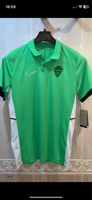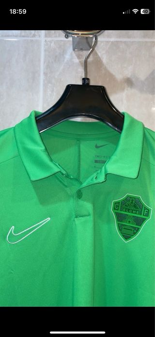 Polo oficial del Elche Club de Fútbol de la marca Nike. Diseño moderno y cómodo. - Color principal verde con detalles blancos y negros. - Escudo del Elche CF bordado en el pecho. - Logo de Nike en el otro lado del pecho. - Cuello tipo polo con botones.
