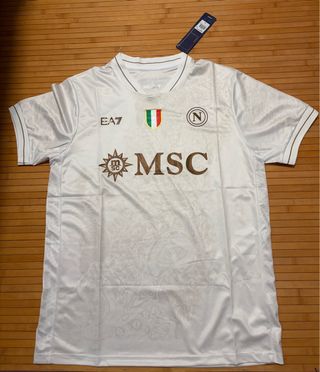 Camiseta del SSC Napoli con un diseño inspirado en Italia. - Color blanco con detalles dorados. - Logo de EA7. - Escudo del equipo y bandera italiana. - Diseño gráfico sutil en toda la prenda.