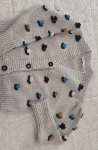 Rebeca de punto con un diseño encantador de flores bordadas por toda la prenda. Es una pieza llamativa y original. - Cierre de botón. - Mangas abullonadas. - Detalle de flores en relieve.
