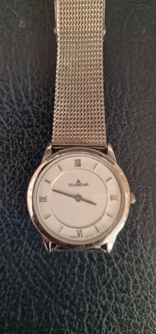 Elegante reloj DUGENA Modena para mujer. - Esfera blanca con detalles plateados. - Correa de malla plateada. - Diseño clásico con números romanos.