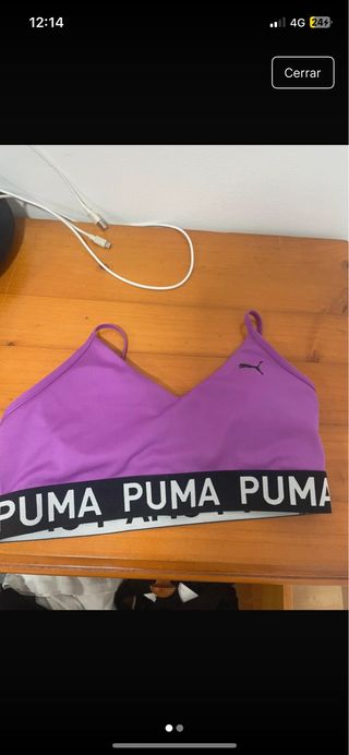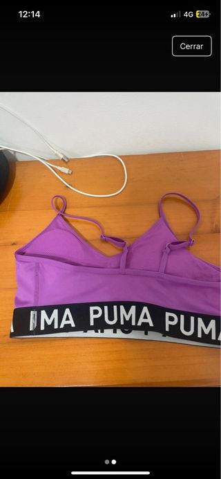 Sujetador deportivo de la marca Puma en color morado. Ideal para actividades deportivas. - Diseño con tirantes finos. - Banda elástica con logo repetido en la cintura.