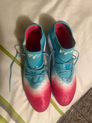 Botas de fútbol Puma Future 8 FG con un diseño degradado de azul a rosa. - Parte superior de punto. - Cierre de cordones. - Suela FG para césped natural y artificial Me las compre por internet y me van granes, talla 44, (gama 230€) Vienen con caja y bolsa