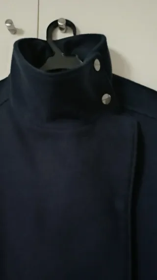 Abrigo de la marca Mango en color azul marino. Talla S - Diseño cruzado con botones de clip. - Cuello solapa. - Detalle de cremalleras en las mangas. - Forro interior En buen estado, lo único que en el interior, donde está la etiqueta, tiene una pequeña zona de polipiel que está deteriorada (ver última foto)