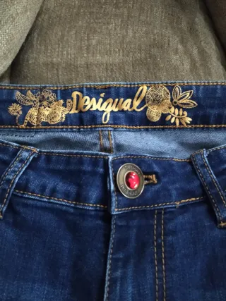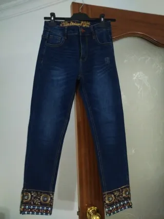 Pantalón vaquero de corte moderno con detalles bordados en los bajos. - Diseño con desgastes sutiles. - Adornos florales y de pedrería en los tobillos. - Cintura con trabillas para cinturón.