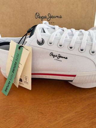Zapatillas de lona de la marca Pepe Jeans en color blanco. Perfectas para un look casual. - Cierre con cordones. - Detalle de línea roja en la suela. - Logo de la marca bordado en el lateral. Estan sin estrenar. Fueron un regalo y le quedan pequeñas a mi marido.