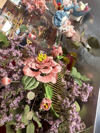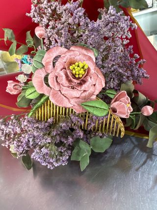 Peineta decorada con flores de tela y detalles dorados. - Diseño floral con pétalos en tono rosa. - Base de peineta metálica dorada.