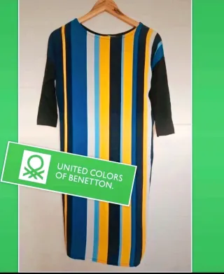 Vestido de United Colors of Benetton con un diseño de rayas verticales. - Diseño de rayas en azul, amarillo y blanco. - Mangas largas en color negro.