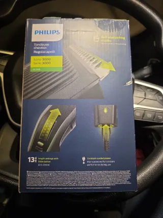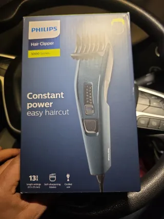 Cortapelos Philips modelo 3000 Series, diseñado para un corte de pelo fácil y con potencia constante. - 13 ajustes de longitud (0.5-23 mm). - Cuchillas autoafilables. - Uso con cable