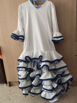 Traje de flamenca artesanal con un diseño único. - Elaborado con tejido blanco con relieve. - Adornado con volantes y detalles en azul. - Mangas acampanadas con el mismo remate. - Cierre de cremallera en la espalda.medidas pecho76cmcadera 82cm Largo desde hombros hasta abajo 92cm Largo de manga 36cm . Se le puede echar unos 2 dedos.
