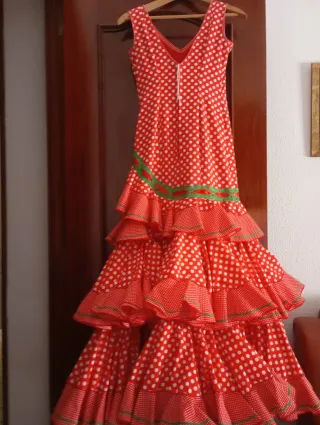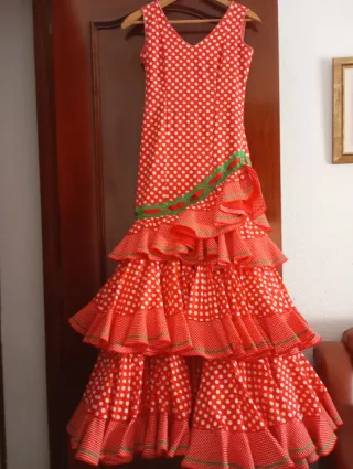 Traje de flamenca artesanal con un diseño vibrante y lleno de volantes. - Cuerpo principal en rojo con detalles de lunares blancos. - Mangas con volantes y detalles de rayas. - Múltiples capas de volantes en la falda. - Adornos de encaje blanco en los bordes de los volantes.medidas pecho 36+36,=72cm cadera37+37=74cm largo desde hombros hasta abajo 115cm. Tiene para echarle dos dedos.