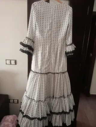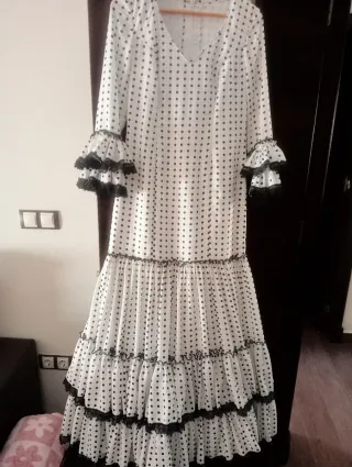 Traje de flamenca con un diseño clásico y elegante. Una sola puesta. - Estampado de lunares negros sobre fondo blanco. - Mangas con volantes y detalles de encaje negro. - Falda larga con varios volantes y remates de encaje y lazo de terciopelo también negro - Cuello en pico. -No pesa nada,super comodo y ligero.