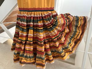 Precioso vestido de flamenca, prácticamente nuevo, con un diseño vibrante y alegre. - Mangas largas con volantes. - Falda con múltiples volantes y detalles de encaje. - Combinación de colores . Tiene un bolsilo interior con cremallera. Se puede sacar o meter de ancho . Cordon para ajustar el escote . Hecho a medida con un acabado impecable