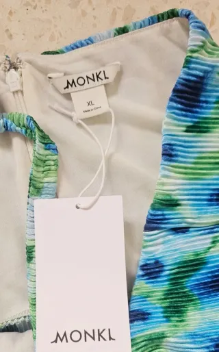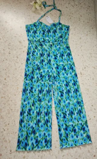 Mono largo de la marca Monkl con un bonito estampado floral en tonos azules y verdes. El tejido es plisado, lo que le da una textura muy especial. - Diseño con tirantes. - Piernas anchas. - Estampado floral vibrante.