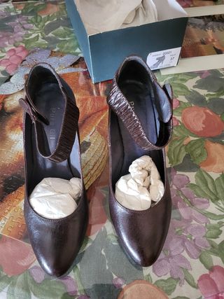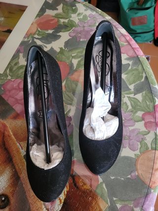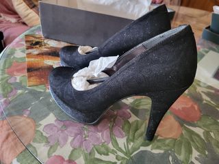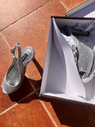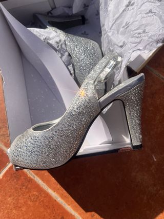 Elegantes tacones con un diseño lleno de brillantes que capturan la luz. - Detalle de pedrería en toda la superficie. - Diseño abierto en la punta. - Correa ajustable en el talón. solo 1 puesta