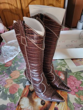 Elegantes botas altas de piel con un diseño texturizado que imita la piel de cocodrilo. - Presenta un pequeño descosido en la parte trasera del talón (de ahí su bajo precio). - Material exterior: Piel (en perfectas condiciones). - Color: Marrón. - Talla: 37. - Cierre de cremallera lateral.