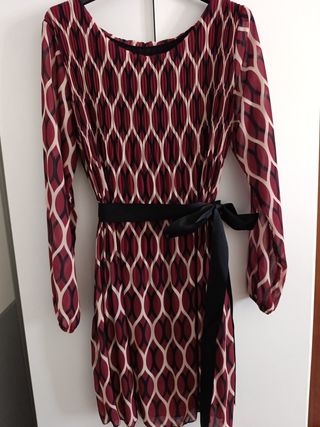 Vestido corto en colores, granate, negro y beige. Talla: M Longitud de manga: larga. La manga es de gasa, transparenta, y la terminación del puño es con gomilla. El resto del vestido es de buena tela, cómoda y no trasparenta. La parte superior es fruncida, la de abajo es suelta con un poco de vuelo. Se puede vestir con lazo en la parte de la cintura.