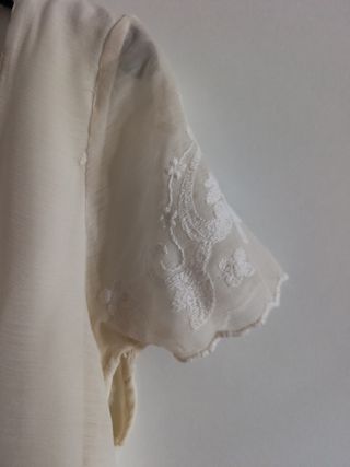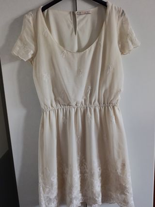 Vestido corto de color beige con delicados bordados. - Mangas cortas con detalle de encaje. - Cintura elástica. - Bajo con diseño floral bordado. - Aunque está tallado en L, equivale a una talla menos. Sería una M
