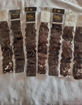 Extensiones de pelo natural rizado en tono castaño de 40cm con keratina - Marca: Rapunzel of Sweden. - Color: Castaño. - Textura: Rizada - 25 mechones en cada paquete, en total 7x 25= 175 mechones