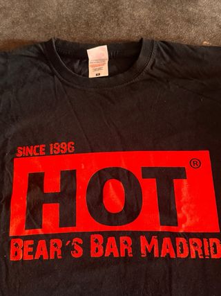 Camiseta negra con diseño frontal de HOT Bear's Bar Madrid. para hombres Lesthers o Bears - - Diseño con texto SINCE 1996 en rojo. - Texto HOT grande en rojo. - Texto BEAR'S BAR MADRID en rojo.Diseño trasero en blanco