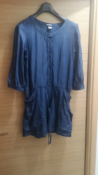 Vestido vaquero de manga tres cuartos. - Cuello redondo. - Cierre de botones. - Cintura con cordón ajustable. - Bolsillos laterales.