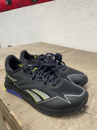 Zapatillas deportivas Reebok Nano X2 en color negro con detalles en verde y gris. - Diseño moderno y deportivo. - Cordones negros con detalles verdes. - Suela con tecnología Floatride Energy.