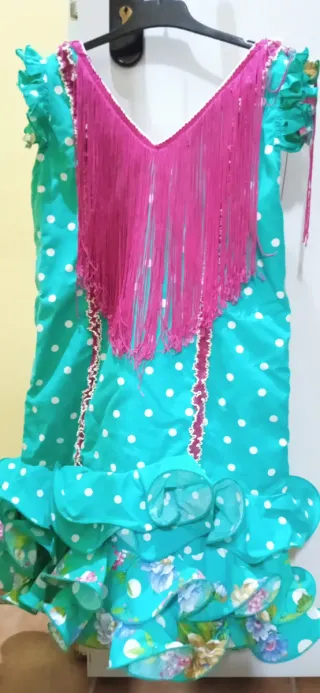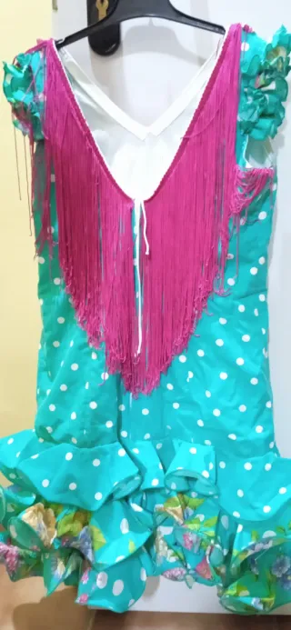 Vestido de flamenca con un diseño alegre y llamativo. - Cuerpo del vestido en color turquesa con lunares blancos. - Adornado con volantes en el bajo y en las mangas. - Detalle de flecos en color fucsia en la parte delantera. - Mangas cortas con volantes.