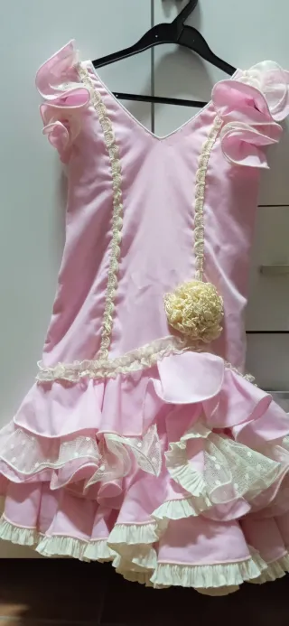 Vestido de gitana con un diseño encantador y muchos detalles. - Adornado con encaje y volantes. - Decoración floral en la cintura. - Mangas con volantes. - Falda con múltiples capas y detalles de puntilla.