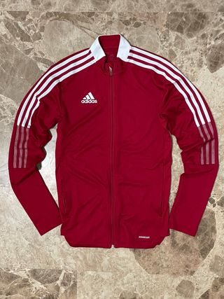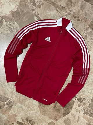 Chaqueta deportiva Adidas en color gris. Presenta el icónico diseño de tres rayas en las mangas. - Cierre de cremallera frontal. - Bolsillos laterales. - Logo de Adidas en el pecho.