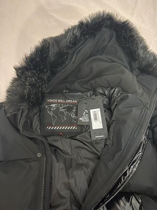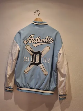 Muy chula. Si uso. Es de tela. Para moto o vestir. Es una XL Chaqueta de motorista de color negro con parques desgastados y bandas doradas. - Cierre de cremallera frontal. - Bolsillos con cremallera. - Cuello alto. - Parches en hombros y codos.