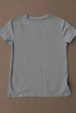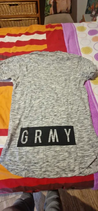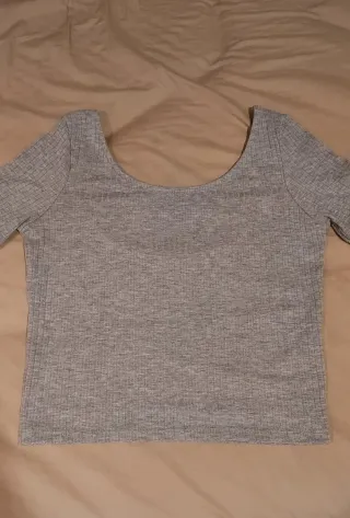 Top-camiseta gris con espalda medio abierta, queda escotado.