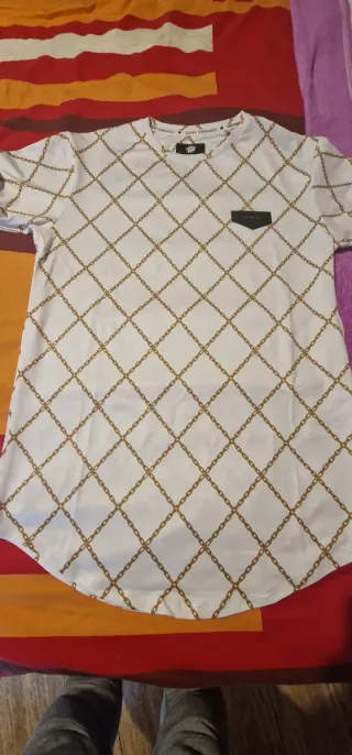 Camiseta de manga corta con un llamativo estampado de cadenas doradas sobre fondo blanco. Presenta un detalle de parche en el pecho. - Diseño de cuello redondo. - Estampado de cadenas en toda la prenda.