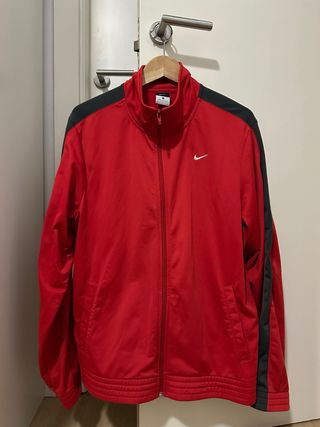 Sudadera deportiva Nike roja y gris con cremallera de cuello alto sin capucha. Talla L, bien conservada, las gomas de cintura y puños están en perfecto estado.