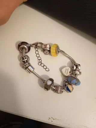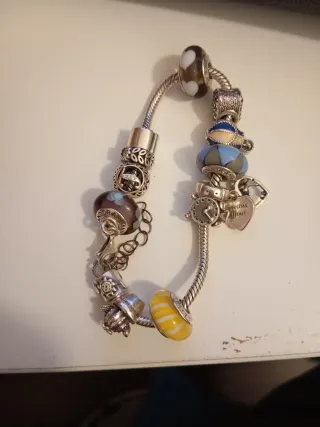 Pulsera de la marca Pandora con varios charms. - Charm con corazón blanco. - Charm con esmalte azul y amarillo. - Charm con forma de corazón y texto. - Charm con diseño de ancla. - Charm con cuentas de cristal y detalles plateados.