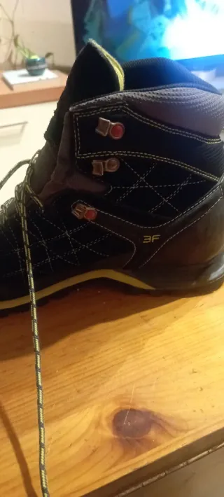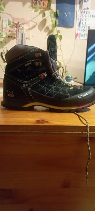 Botas de montaña Salewa con un diseño robusto y detalles llamativos. - Exterior en negro con costuras y detalles en amarillo y rosa. - Membrana GORE-TEX para impermeabilidad. - Suela de goma para un buen agarre. - Cierre con cordones.