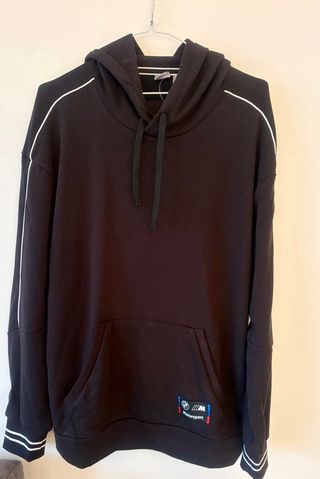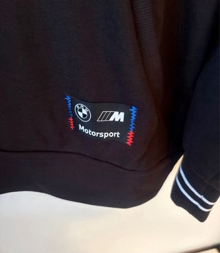 sudadera con capucha Puma BMW Motorsport Statement en color negro. Se caracteriza por su diseño deportivo inspirado en el mundo del automovilismo, con el logotipo de BMW M Motorsport en un parche en la parte frontal y detalles de rayas blancas en contraste en las mangas y los puños. Diseño: Estilo "Statement" con capucha ajustable mediante cordón y bolsillo tipo canguro. Detalles: Incluye ribetes blancos que recorren los hombros y las mangas, además de puños y dobladillo acanalados con doble raya blanca. Composición: Suele estar fabricada en una mezcla de algodón (aprox. 68%) y poliéster para mayor comodidad y durabilidad.