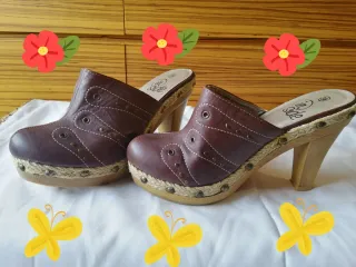 Zuecos de la marca Inside, con un diseño moderno y cómodo. Tacón 11cm. Imitación piel con remaches de cobre. - Detalle de pespuntes blancos. - Tachuelas decorativas. - Plataforma con acabado de esparto. - Tacón grueso de madera.