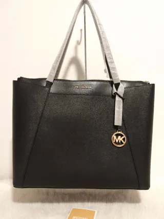 Bolso de mano Michael Kors en color negro. Un accesorio elegante y espacioso. - Material de cuero texturizado. - Cierre superior con cremallera. - Detalle de logo MK dorado. - Asas cómodas para llevar al hombro.
