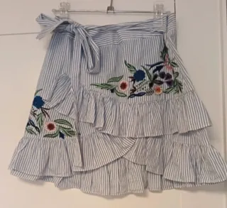 Falda con un diseño de rayas azules y blancas, con un bonito bordado floral. - Diseño de volantes en cascada. - Cierre con lazada. - Talla única.