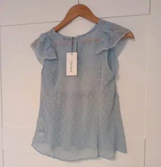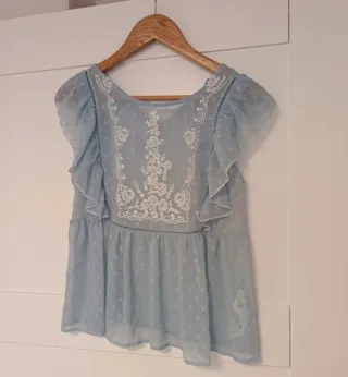 Camisa de manga corta con un bonito bordado floral en la parte delantera. El tejido es ligero y tiene un estampado de topos sutil. - Diseño con volantes en las mangas. - Bordado blanco detallado en el pecho. - Tejido ligero con estampado de topos.