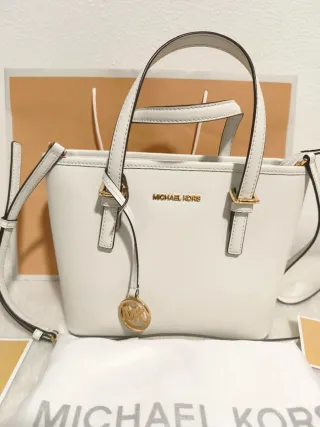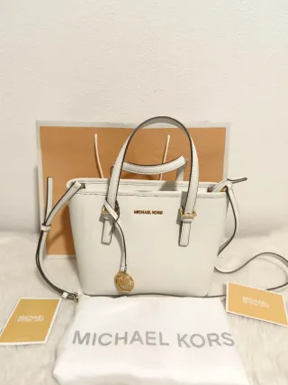 Bolso Michael Kors de color blanco, con detalles dorados. Original con etiqueta Medidas, alto 20cm. largo 24cm Lleva su guardapolvo y bolsa de papel - Asa corta para llevar en mano. - Correa larga ajustable para llevar cruzado o al hombro. - Charm con el logo de la marca. - Incluye bolsa guardapolvo.