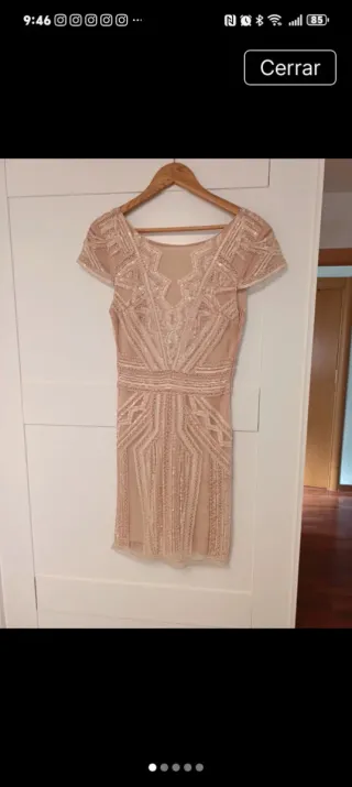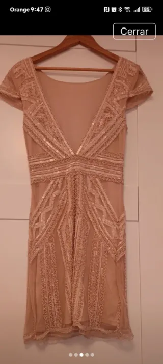 Elegante vestido de fiesta con detalles de pedrería. - Diseño corto con mangas. - Escote pronunciado en la espalda. - Adornado con lentejuelas y abalorios.