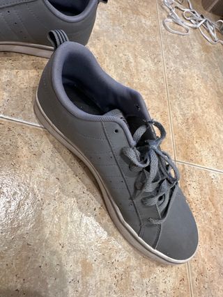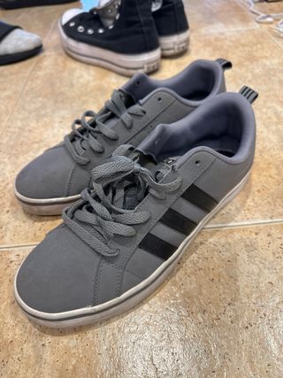 Zapatillas deportivas Adidas con un diseño moderno y cómodo. - Parte superior de ante sintético gris. - Tres rayas laterales negras. - Cierre de cordones. - Suela de goma blanca.