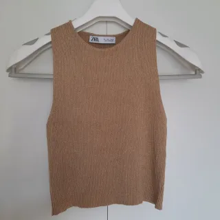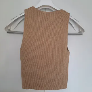 Top de punto con un acabado brillante en color beige y dorado. Es un modelo sin mangas y con cuello redondo. - Tejido de canalé. - Diseño de corte recto.